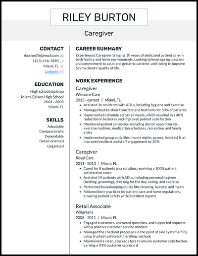 Caregiver Resume Sample Tips Skills Job Description More